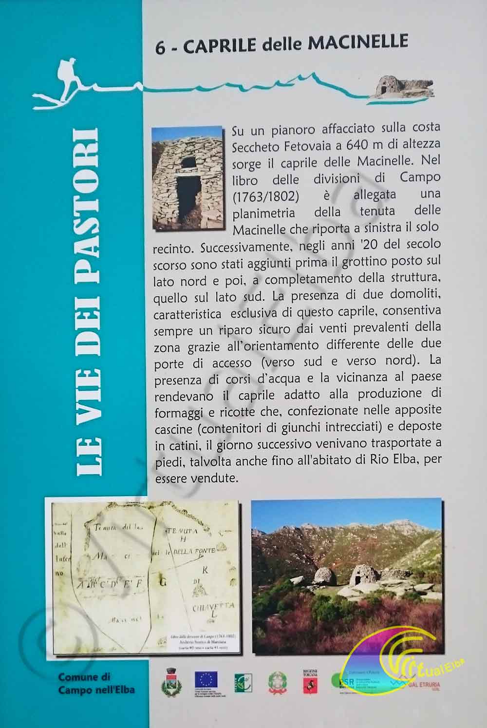 Le Macinelle es una meseta que domina la costa Seccheto Fetovaia a 640 m de altura, aquí se encuentra el Caprile delle Macinelle. En el libro de divisiones de Campo (1763/1802) se adjunta un plano de la Macinelle que muestra únicamente el recinto de la izquierda. Posteriormente, en la década de 1920, se añadió primero la pequeña gruta del lado norte y luego, para completar la estructura, la del lado sur.