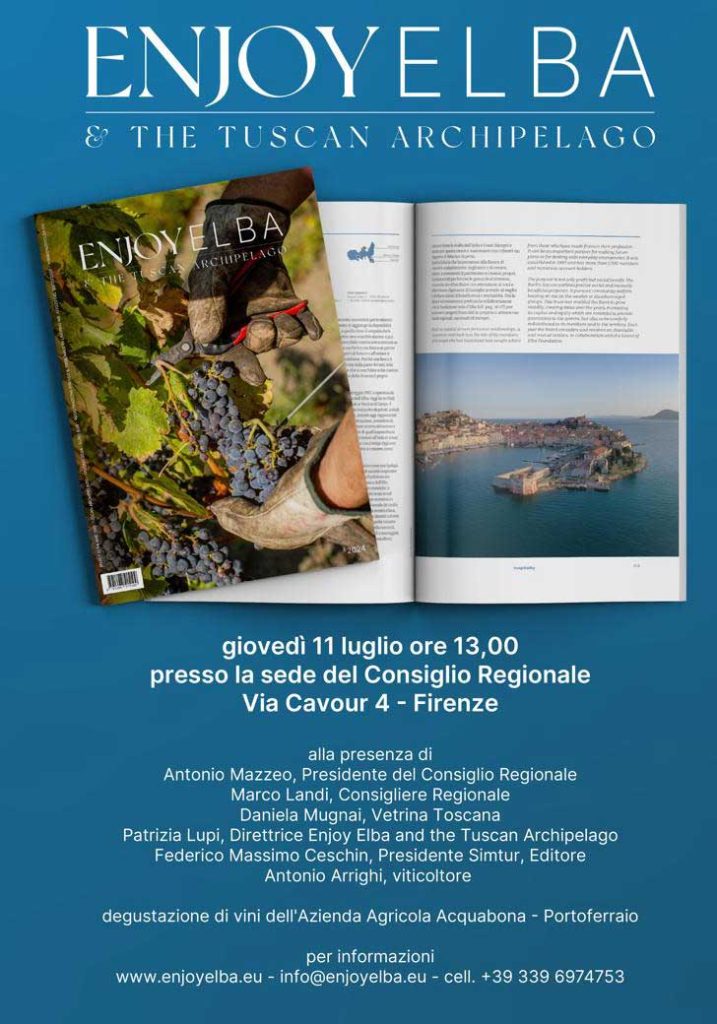 El próximo jueves 11 de julio, en Florencia, en la sede del Consejo Regional en Via Cavour 4, a las 13.00 horas, se publicará la séptima edición de Enjoy Elba y del Archipiélago Toscano, la revista que será presentadocuenta las islas de la Toscana, revelando sus rincones más escondidos, hojeando los libros y archivos de la historia, observando su bio y geodiversidad bajo el microscopio. Sin perder de vista la actualidad con sus columnas dedicadas al estilo de vida, la hostelería y la gastronomía y el vino.