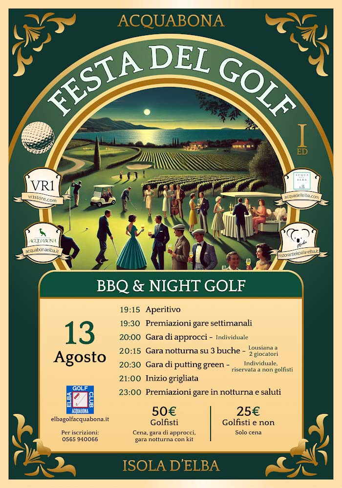 La velada incluye un aperitivo de bienvenida, una carne a la brasa y divertidas actividades nocturnas para todos: golfistas, deportistas, curiosos o personas de todas las edades que quieran acercarse al mundo del golf: un deporte dedicado al bienestar y al contacto con la naturaleza. . La nueva junta directiva, en la que figuran el nuevo presidente Pietro Vallardi y el vicepresidente Federico Ballati, junto con sus socios, se complace en invitar a todos los habitantes de Elban, turistas y amigos, a pasar una agradable velada juntos.